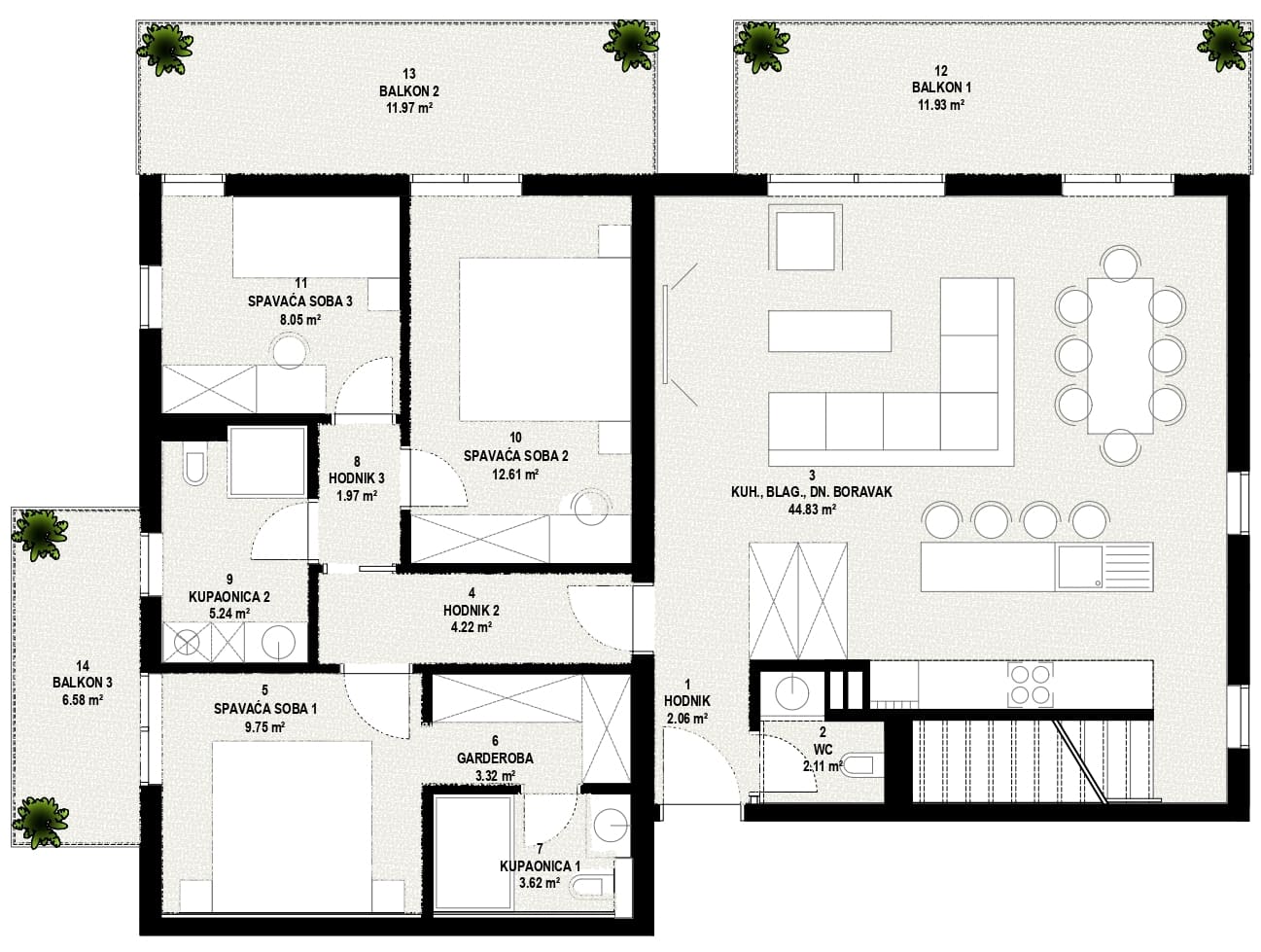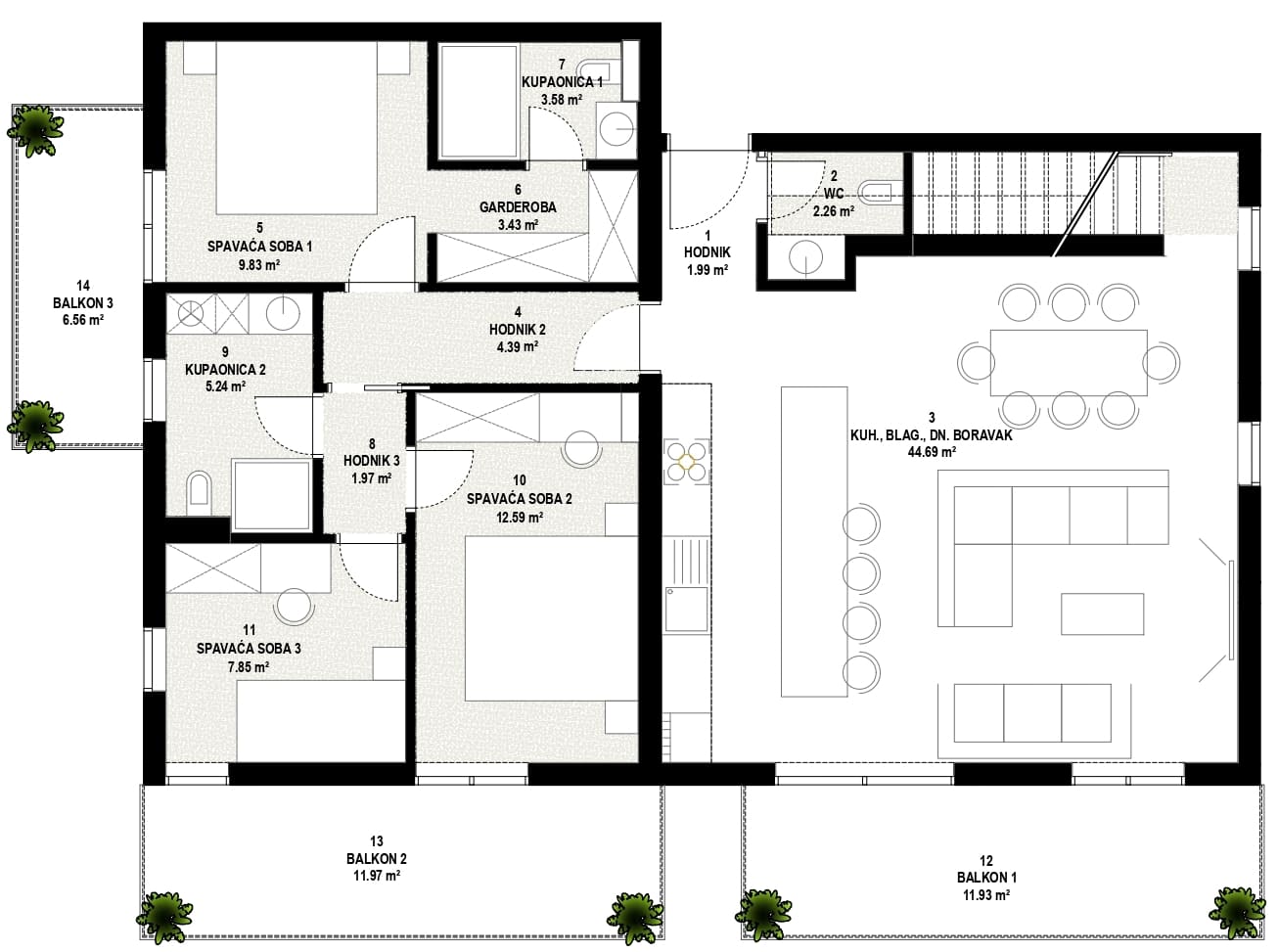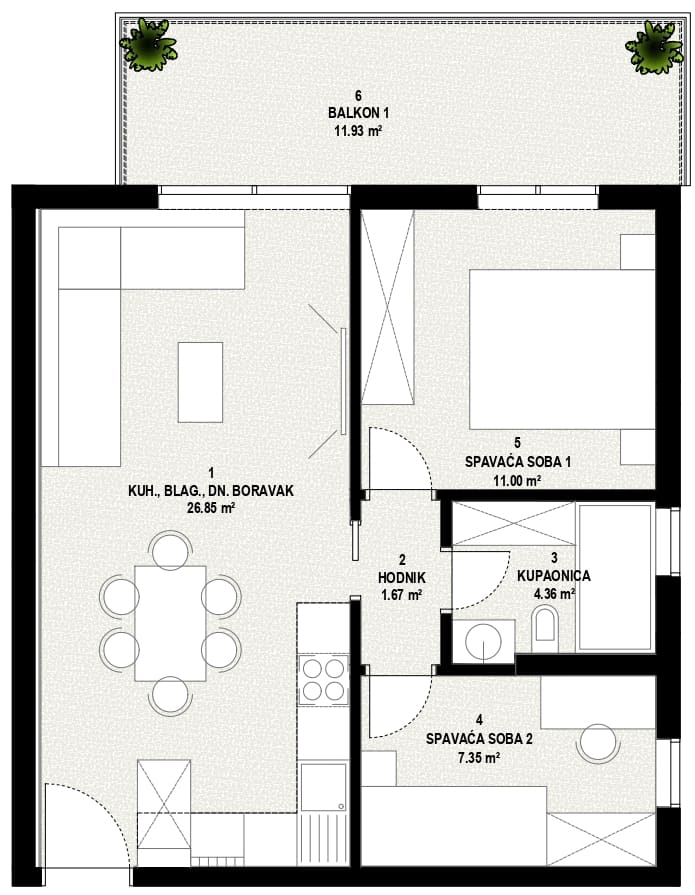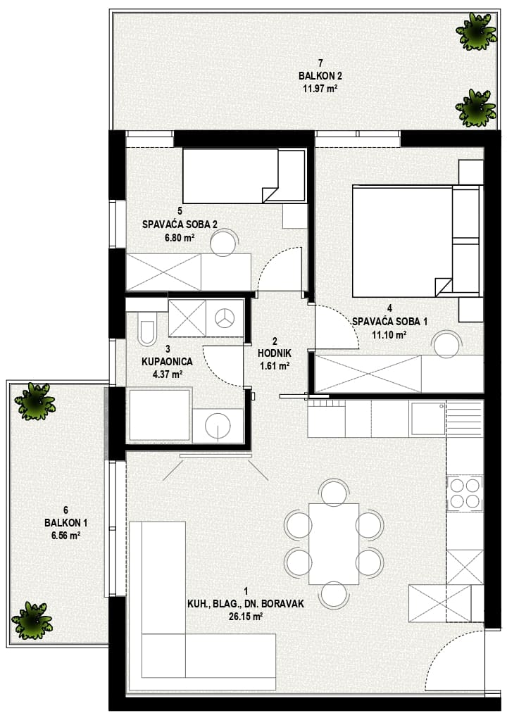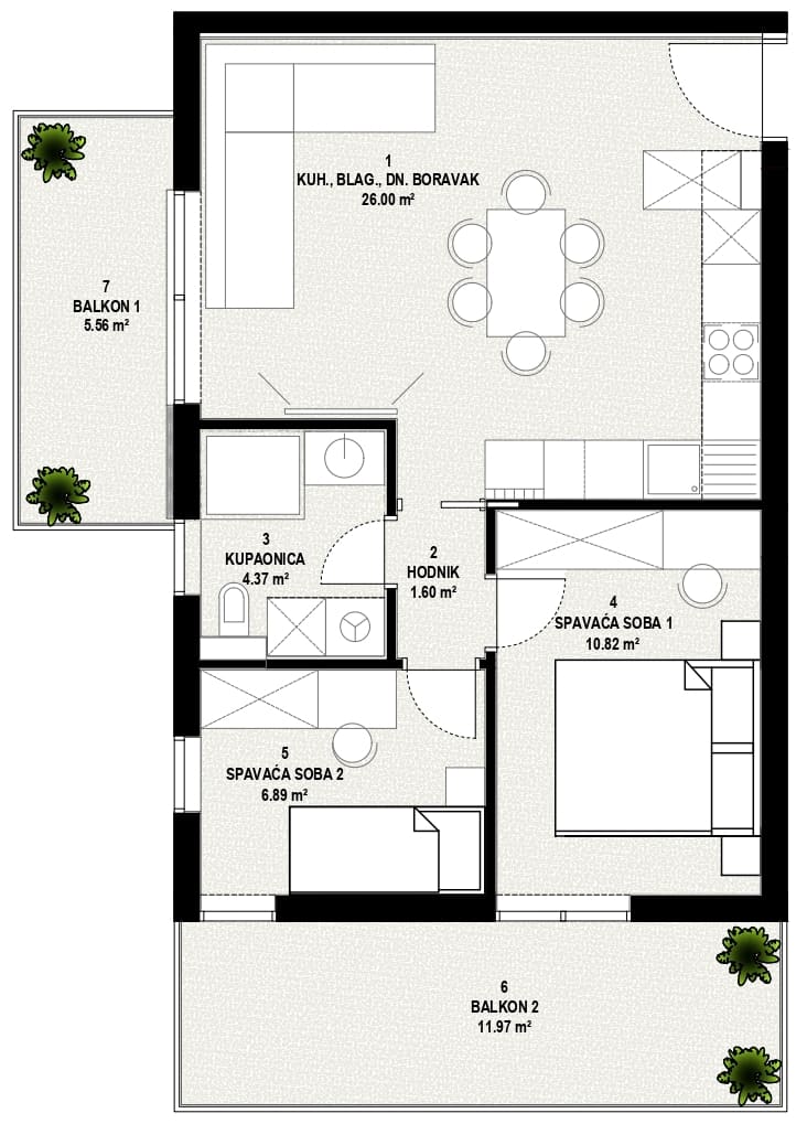 Stan je pažljivo projektiran kako bi omogućio maksimalno iskorištenje prostora i udobnost. Otvoreni dnevni prostor ispunjen je prirodnim svjetlom, dok su spavaće sobe smještene tako da pružaju mir i privatnost. Dva balkona dodatno proširuju životni prostor i nude mogućnost za opuštanje na otvorenom.