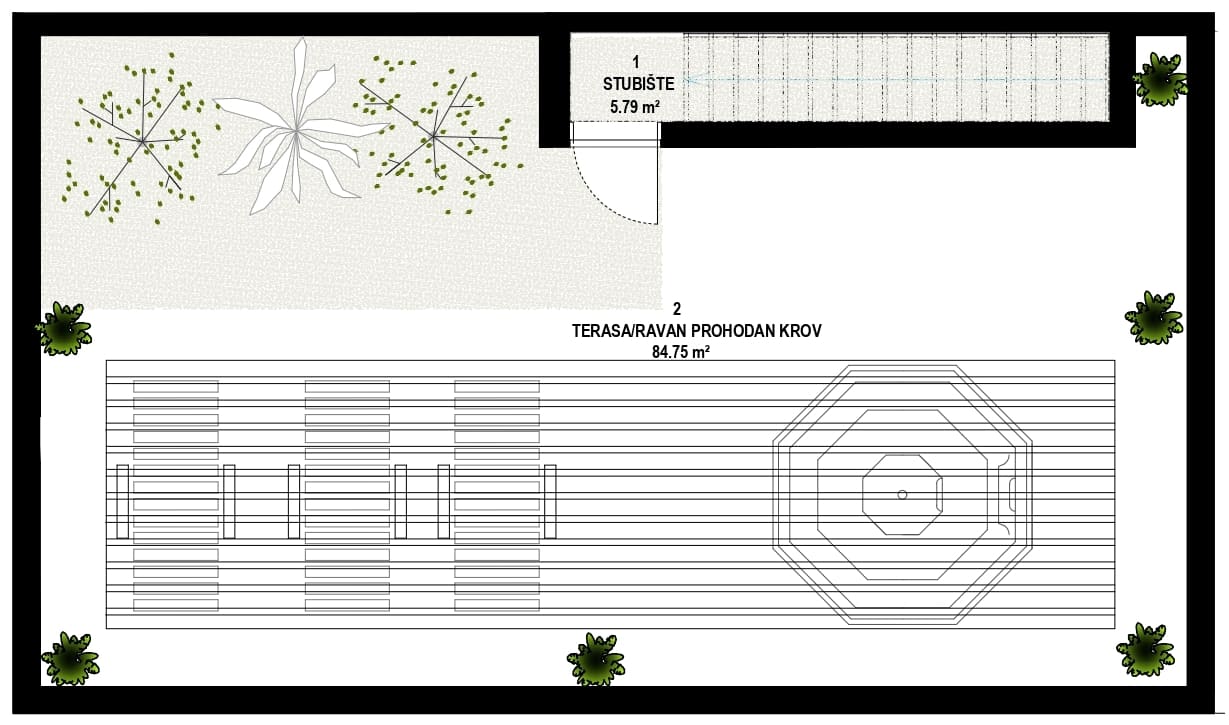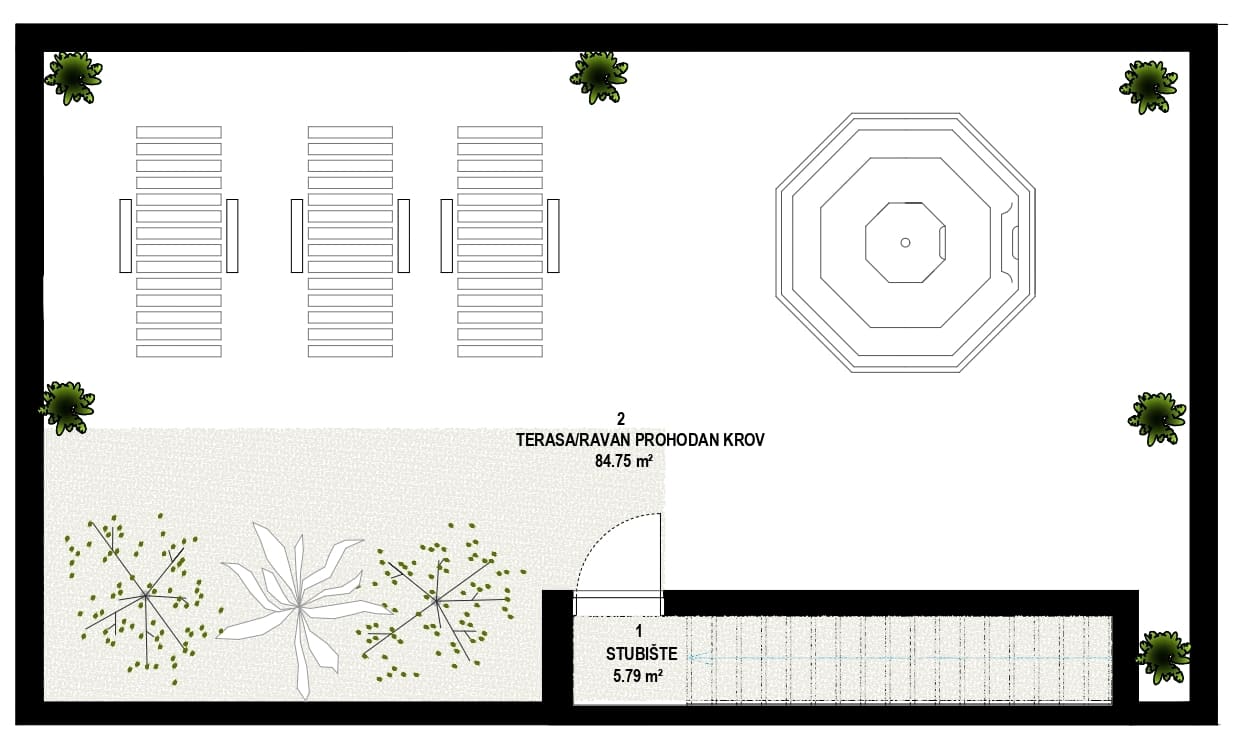 Prodaje se moderan četverosoban stan ukupne neto površine 120.55 m², s dodatnom krovnom terasom površine 26.66 m², smješten na 1. katu novogradnje.